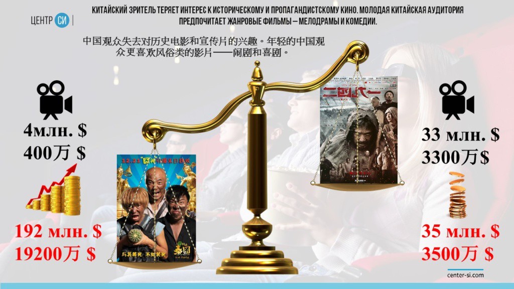 Более того, китайский зритель теряет интерес к историческому и пропагандистскому кино. Молодая китайская аудитория предпочитает жанровые фильмы – мелодрамы и комедии. Позиционируется, что один из наиболее успешных проектов китайской индустрии сериал «Затерянные в Тайланде». Критерием успешности называется валовый сбор от проката. Действительно, малобюджетная комедия стоимостью 4 млн. долларов заработала в китайском прокате 192 млн. долларов и в разы обошла крупномасштабный патриотический фильм о героическом сопротивлении китайского народа японским захватчикам «Вспоминая 1942-й», собравшим всего 35 млн. долларов. Неужели в Китае критерием оценки кино стали кассовые сборы, а не общественная значимость?