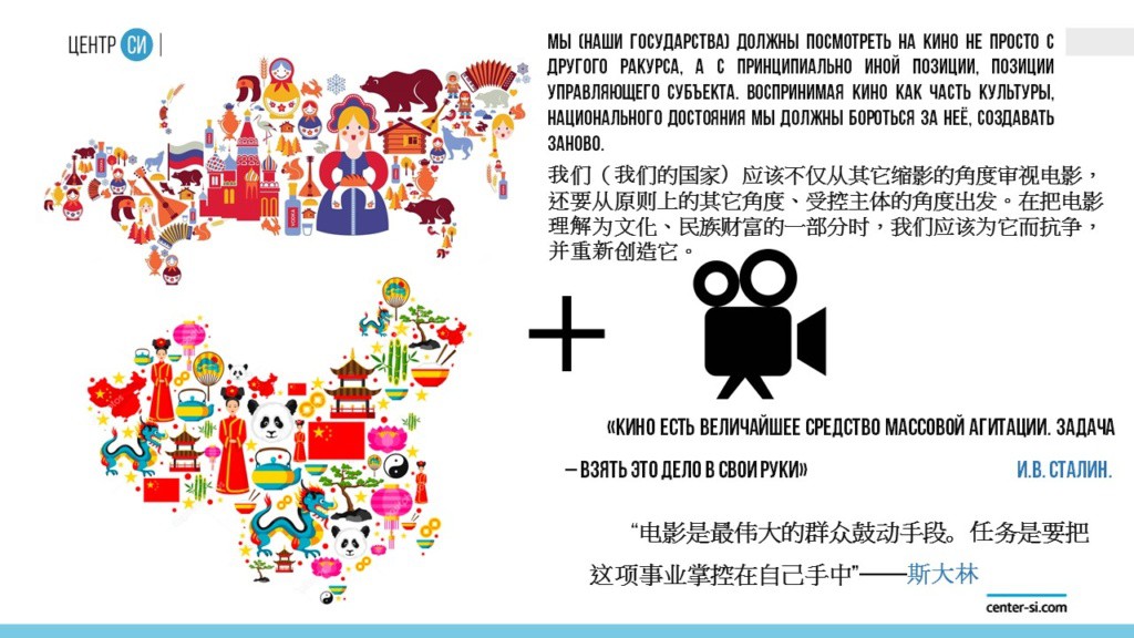 При этом нужно учитывать, что в настоящее время уже недостаточно просто выпускать кино. Нужно формировать к нему интерес. Мы (наши государства) должны посмотреть на кино не просто с другого ракурса, а с принципиально иной позиции, позиции управляющего субъекта. Воспринимая кино как часть культуры, национального достояния мы должны бороться за неё, создавать заново. «Кино есть величайшее средство массовой агитации. Задача – взять это дело в свои руки» – И. В. Сталин.