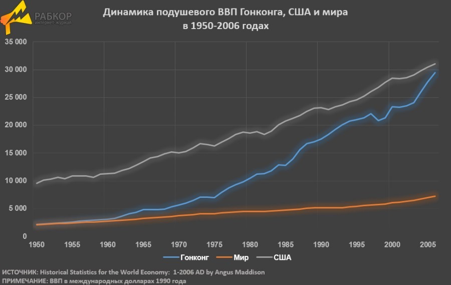 За последние полвека экономика мегаполиса росла фантастическими темпами После Второй мировой войны Гонгонг представлял собой довольно бедный город. Согласно вычислениям Ангуса Мэддисона, подушевой ВВП Гонконга вчетверо уступал американскому и соответствовал показателям Перу, Венгрии и Мексики. А в 1990-е годы он уже вышел на уровень развитых стран Запада. После 1997 года, когда Гонконг перешел под китайский суверенитет, его темпы остались такими же быстрыми. Сейчас душевой ВВП мегаполиса превышает любую крупную страну Запада, включая и США. О благополучии горожан свидетельствуют и показатели здоровья. Ожидаемая продолжительность жизни в Гонконге превышает 84 года, второе место среди государств мира. Мегаполис входит в число государств с лучшим школьным образованием по оценкам PISA. О качестве работы государственных структур свидетельствует индекс восприятия коррупции, в котором Гонконг традиционно находится среди полутора десятков наименее коррумпированных стран.
