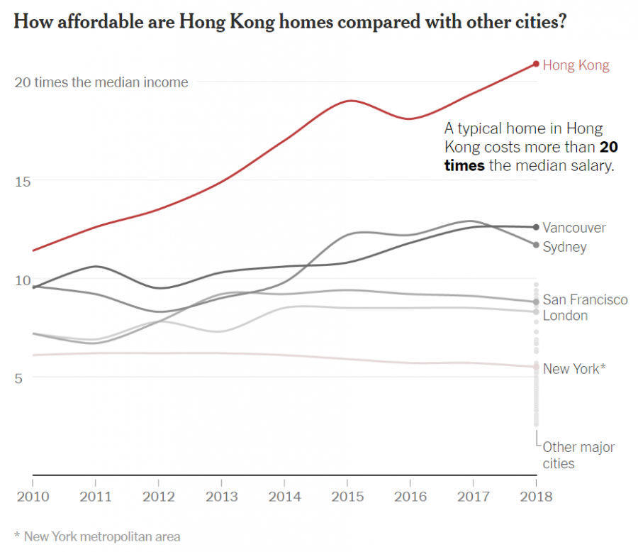 Приток частного богатства вместе с дефицитом земли привел к чрезвычайному вздорожанию недвижимости. Квадратный метр в квартире минимальных размеров обойдется жителю Гонконга в среднем в $22 000. Обычная квартира в мегаполисе стоит примерно 19 медианных годовых доходов, что много выше, чем в богатейших городах Запада с высокими ценами на недвижимость. В Коулуне квартира площадью 430 квадратных футов (40 м2) стоит 4,34 млн. гонконгских долларов. За такую сумму можно приобрести старинный замок в Италии или Франции, оборудованный всеми удобствами.