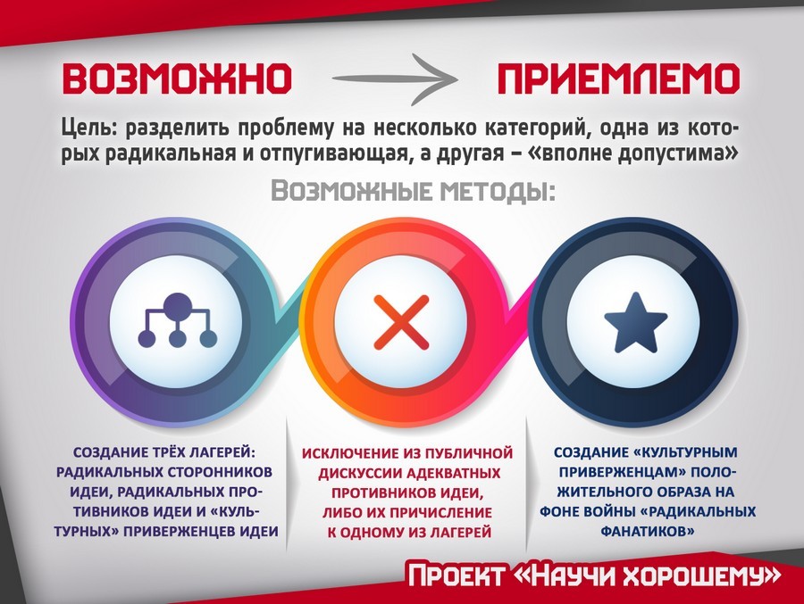 Также в массы начинают транслировать множественность точек зрения. Для этого по крайним флангам расставляются сообщества, продвигающие «градации серого». С одной стороны – нерукопожатные радикалы, которых высокоразвитое общество вынуждено терпеть, а с другой – вполне респектабельные джентльмены, которых принимают в лучших домах «Парижа и Лондона».