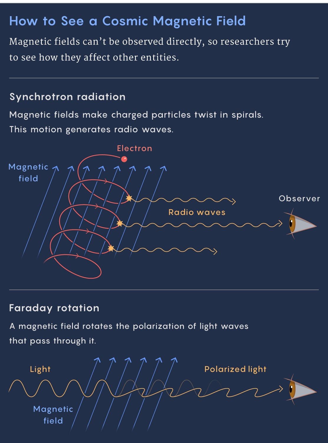 Один из методов, впервые предложенный английским ученым Майклом Фарадеем еще в 1845 году, обнаруживает магнитное поле по тому, как оно вращает направление поляризации света, проходящего через него. Величина "вращения Фарадея" зависит от напряженности магнитного поля и частоты света. Таким образом, измеряя поляризацию на разных частотах, вы можете сделать вывод о силе магнетизма вдоль линии визирования. “Если вы делаете это из разных мест, вы можете сделать 3D-карту”, - сказал Энслин.