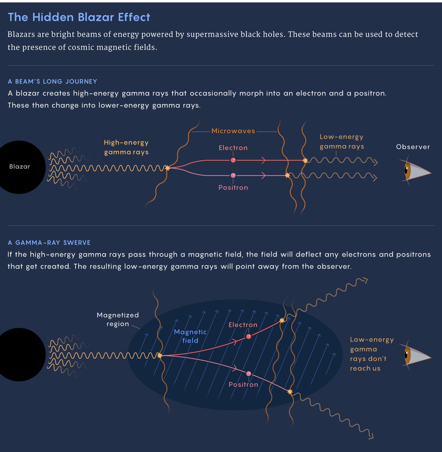 Blazars-это яркие пучки гамма-лучей и других энергетических источников света и материи, питаемых сверхмассивными черными дырами. Когда гамма-лучи путешествуют в пространстве, они иногда сталкиваются с древними микроволнами, превращаясь в результате в электрон и позитрон. Эти частицы затем шипят и превращаются в низкоэнергетические гамма-лучи.