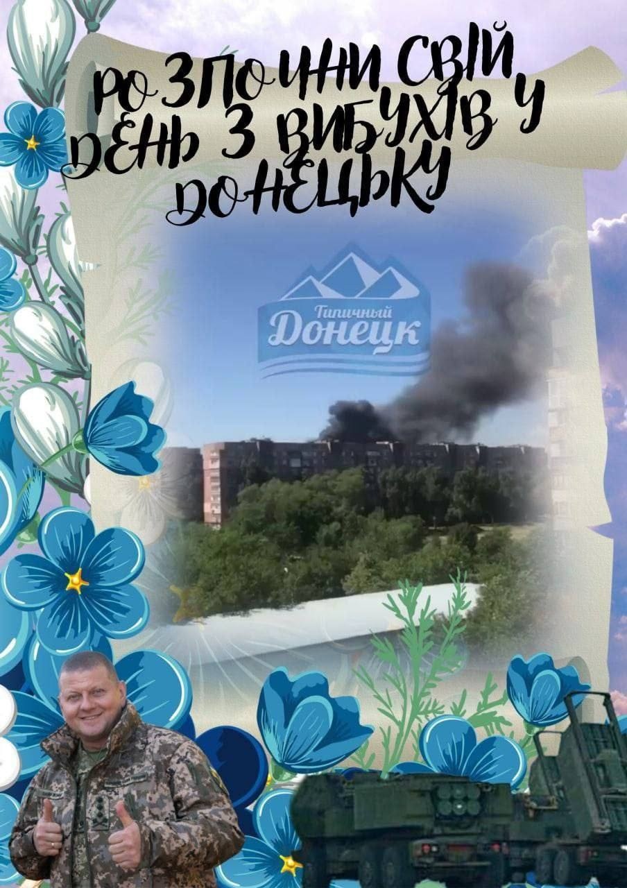 День нацисты предлагают начинать с открытки "Со взрывов в Донецке" на которой улыбающийся ублюдок из ВСУ наслаждается гибелью мирного населения.