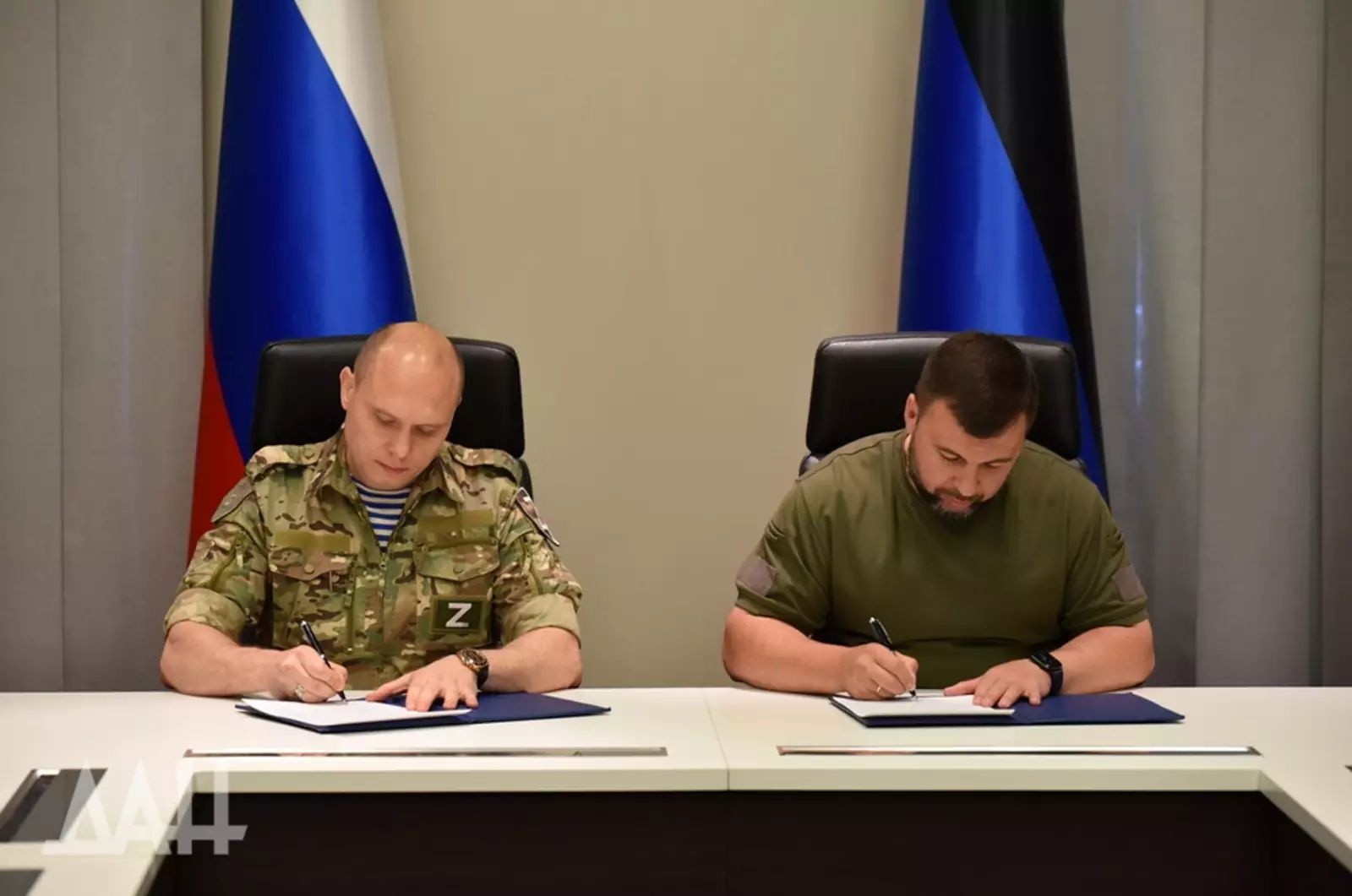Глава ДНР Денис Пушилин и руководитель ВГА Харьковской области Виталий Ганчев подписали в Донецке совместное коммюнике.