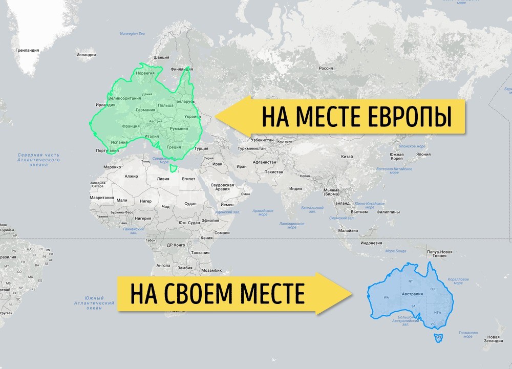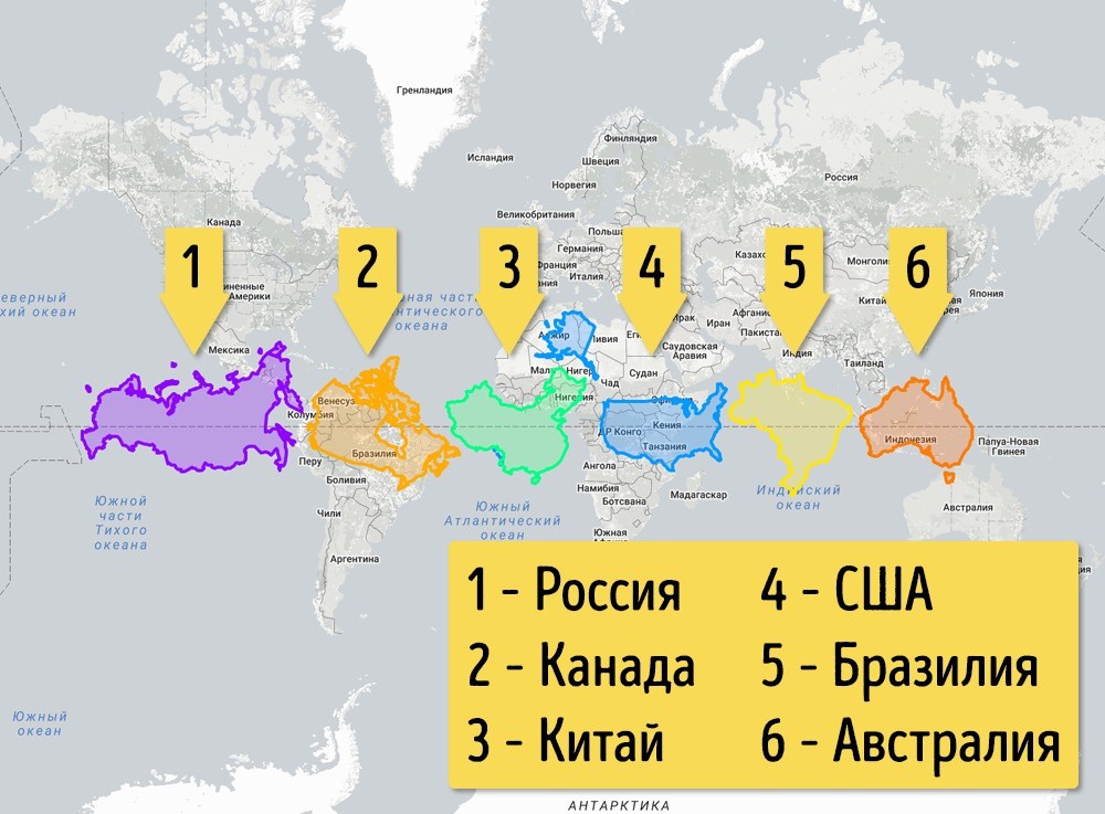 Россия, конечно, по-прежнему огромна, но не такой супергигант, каким она кажется, находясь в своих широтах. И еще тут прекрасно видно, насколько велика Австралия.
