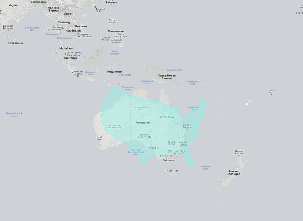 А вот США (без Аляски) в сравнении с Австралией. Как выяснилось, они почти одинаковы по размеру