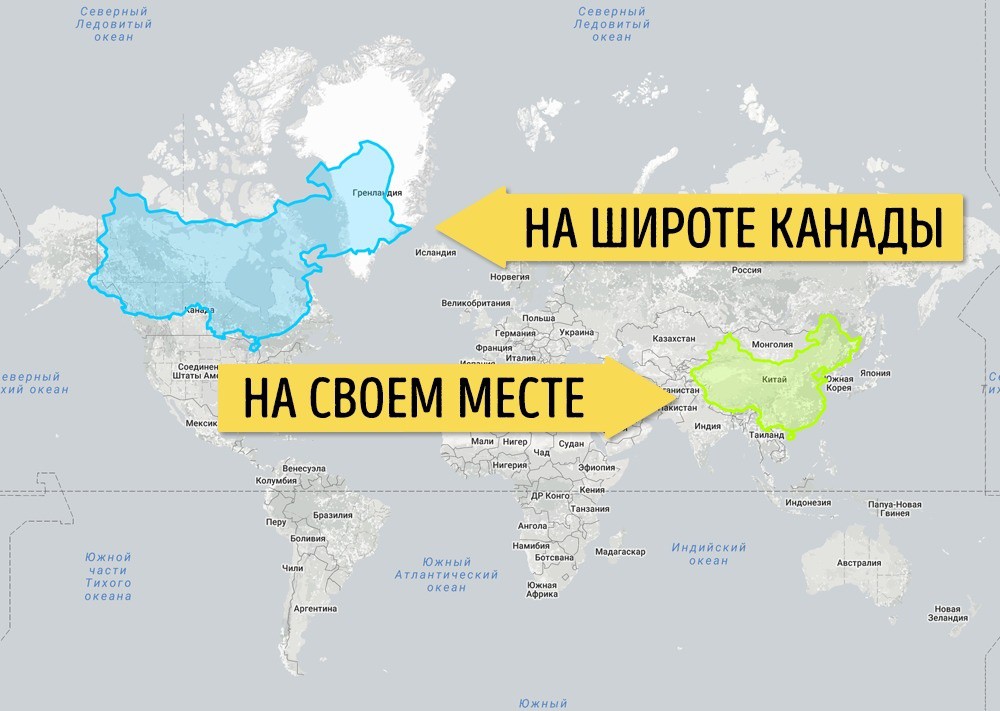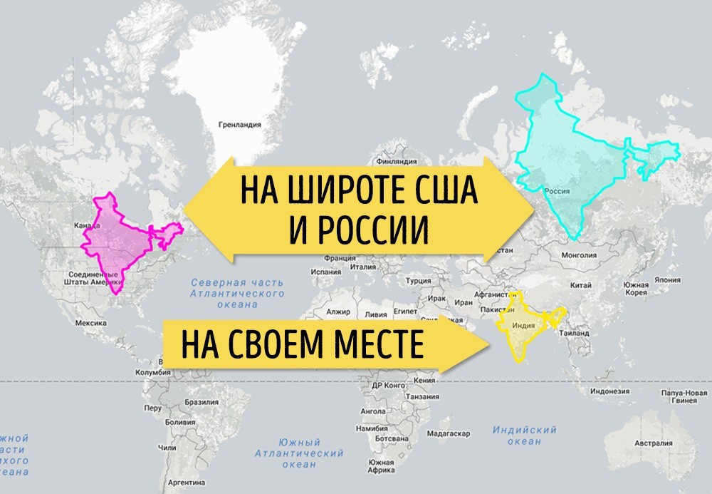 Но при перемещении Гренландии на широту США видно, что она совсем не такая большая. А при переносе на экватор и вовсе понятно, что это просто остров, а не остров-гигант.