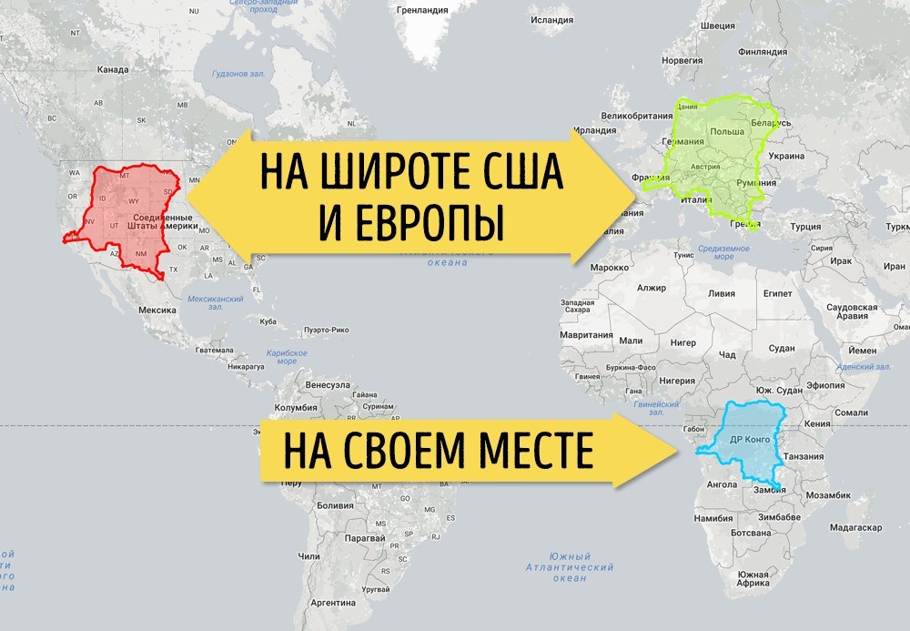 Все страны на Африканском континенте выглядят какими-то маленькими. Это все из-за того, что они расположены на экваторе. Посмотрите, как Республика Конго покрыла почти половину США и большую часть Европы.
