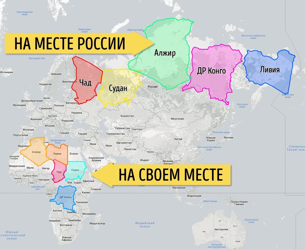 Алжир, Демократическая Республика Конго, Судан, Ливия и Чад — довольно большие страны, но обычно этого не видно из-за их положения. А на самом деле, если «слепить» вместе эти пять стран, по площади они будут почти как Россия.