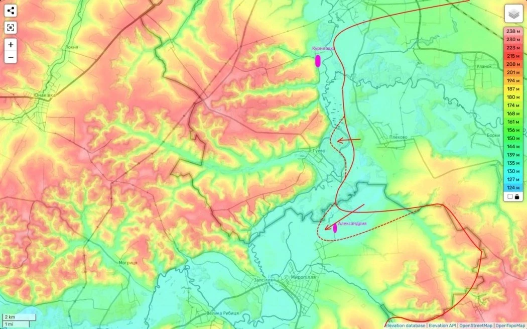 Для понимания обстановки. По сути пустой хутор севернее Мирополья. А это очень крупное село, с очень хорошо выстроенной логистикой и подходящей сюда асфальтированной дорогой из Сум.