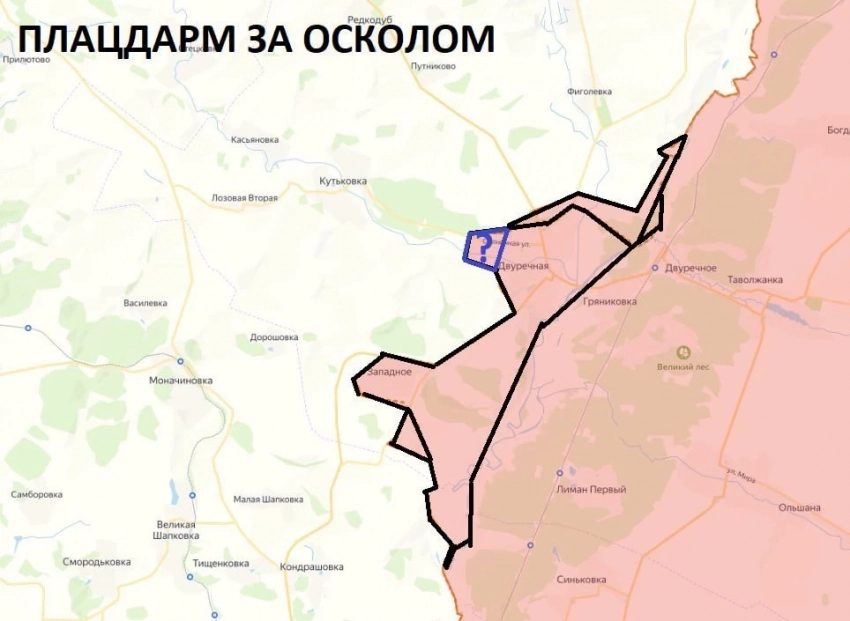 Накануне пошли многочисленные привязки с нашего плацдарма за Осколом. На текущий момент, практически все данные о нашем продвижении подтверждены, даже соединение плацдармов у Двуречной и Новомлынска доказано. Единственное «но», пока мы не получили привязку из западной части Двуречной, а так контуры контроля ясны. По-прежнему загадкой остается количество сил и средств на плацдарме, для этого необходимо увидеть кадры наших атак. Одно можно сказать наверняка - ВСУ запустили ситуацию за Осколом, и теперь простого выхода для них не осталось.