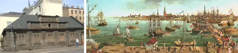 Рижская купеческая гильдия, также известная как Большая гильдия Риги или гильдия Святой Марии (Die Große Gilde zu Riga/St. Marien-Gilde), была немецкой купеческой гильдией в Риге, где немецкие торговцы стали играть более заметную роль в жизни города. В XIV веке город Рига находился под властью Ливонского ордена и под сильным влиянием Ганзейского союза. Здесь процветали торговые отношения, строительство и ремесла, а река Даугава (Западная Двина), протекающая по территории современных России, Белоруссии и Латвии, была старейшим водным путем международного торгового пути между Балтийским и Черным морями еще с V века. В истории мореплавания этот путь чаще называют торговым путем из варяг в греки или янтарным путем Даугава-Днепровье. Сюда импортировались металлические изделия, специи, соль и различные ткани, а основными экспортируемыми товарами были воск, лен, пенька, древесина и меха. В XIII веке Рижский городской совет заключил договоры о международной торговле и товарообмене с русскими княжествами, а позднее и с ганзейскими городами, став таким образом значимым межгосударственным торговым портом и членом Ганзейского союза. На фото слева: жилье ганзейских купцов — охраняемое наследие в Риге. Источник: tripadvisor.com. На фото справа: морской порт Риги.
