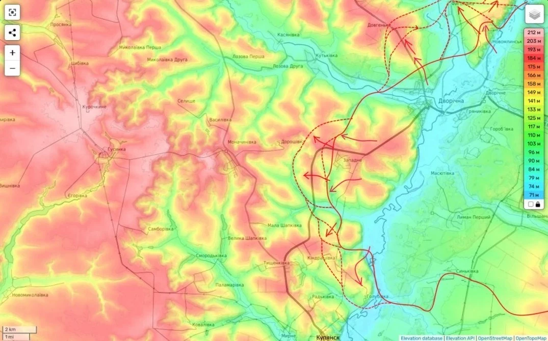 Основные направления движения здесь - на Каменку (сразу со стороны н.п. Дополи и Фиголевка).также наши подразделения вышли на окраины Кондрашовки (это попытка перерезать трассу Купянск - Большой Бурлук и охват Купянска с северо-запада.