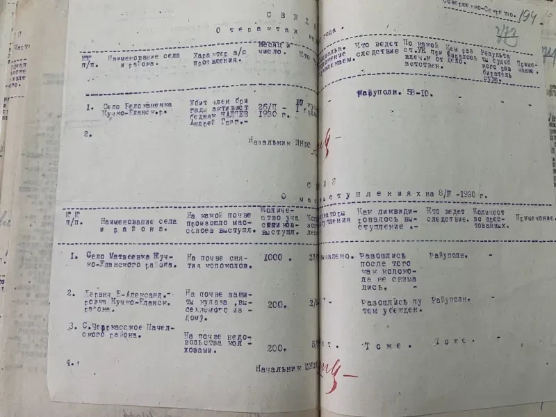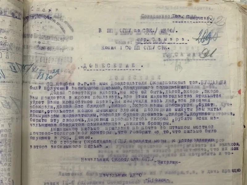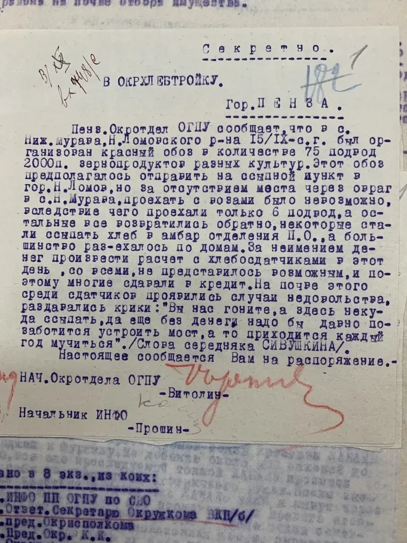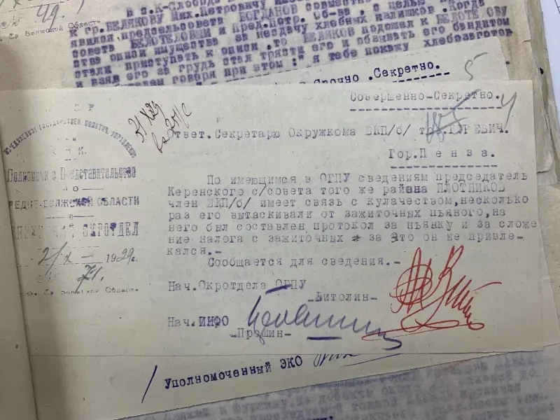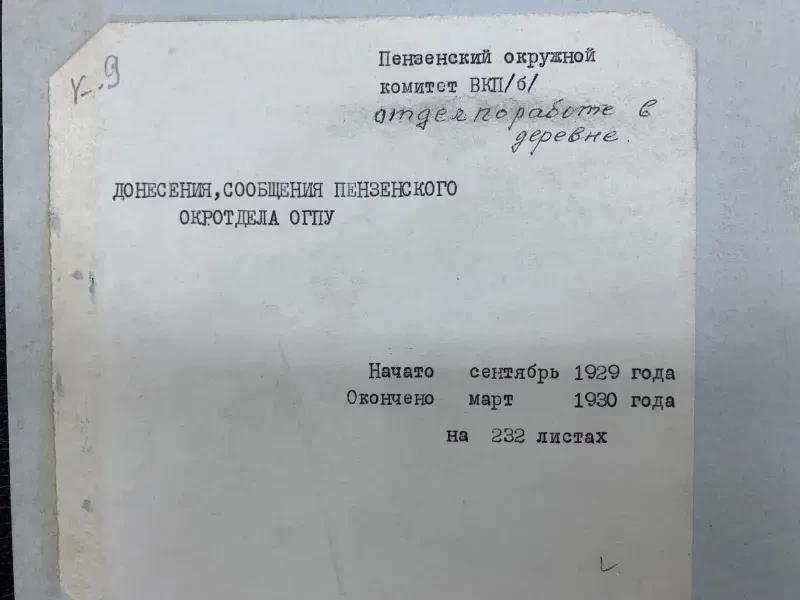 Документы истории. Сегодня мы продолжаем знакомиться с документами пензенского партийного архива, находящимися в папке с донесениями Пензенского окротдела ОГПУ с сентября 1929 и по март 1930 года. То есть это время самого начала коллективизации советской деревни. Из предыдущего материала, думается, каждому было понятно, с какими огромными трудностями столкнулась советская власть на пути установления колхозного строя в деревне, начиная от нехватки кадров и до нехватки материальной базы, нередко имеющейся, но почему-то ржавевшей под снегом.