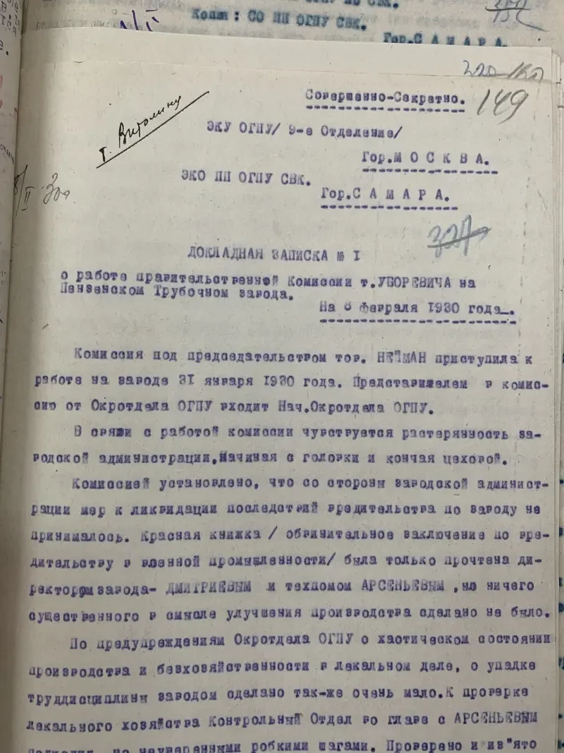 Ну а эта докладная записка в ОГПУ попала в крестьянские дела, скорее всего, случайно, потому что касается проверки на одном из пензенских военных заводах. Очень интересные факты в ней изложены…