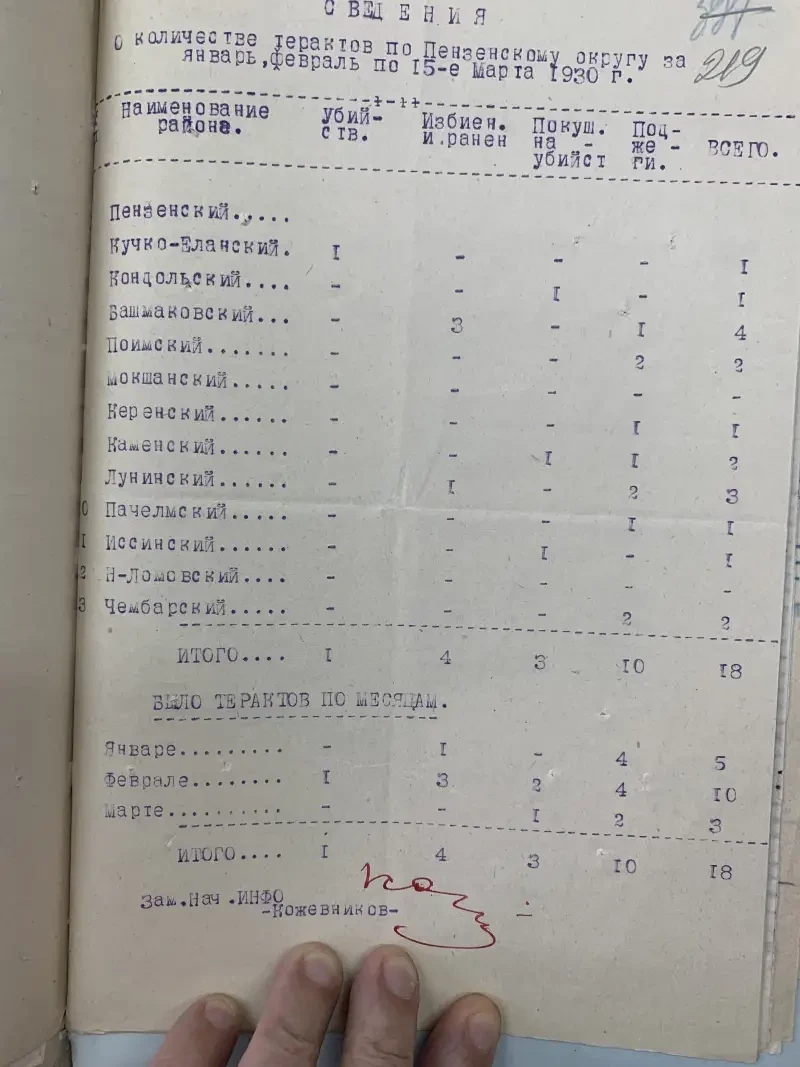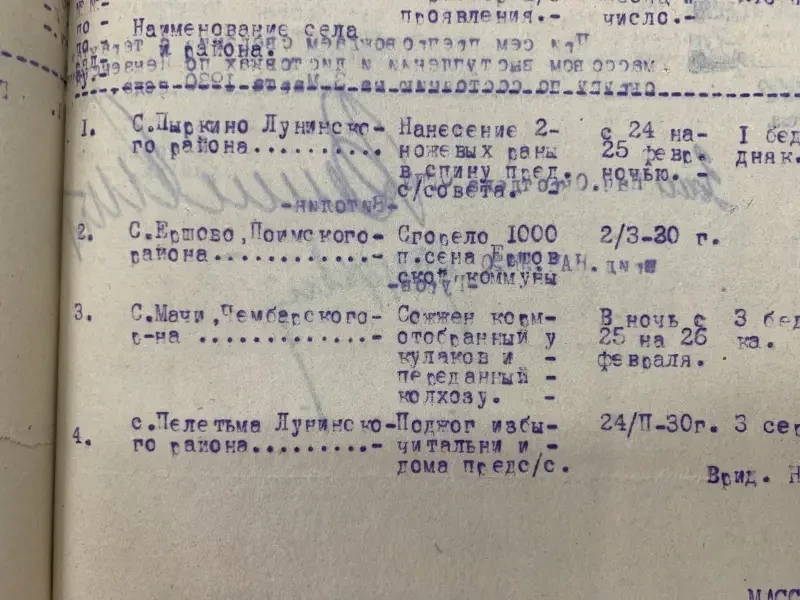 В крестьянских анкетах (а их в рассекреченном в 90-е годы ХХ века фонде Пензенской избирательной комиссии (по раскулачиванию) Пензенского государственного архива хранится свыше 6,5 тысячи личных дел) есть факты, что конфисковывались даже самовары и... рейтузы. Как итог, только в четырех районах Пензенского округа зимой 1929/30 годов было таким образом ликвидировано 1400 крестьянских хозяйств. Так что озлобление многих крестьян «на такую жизнь» было совсем неудивительно.