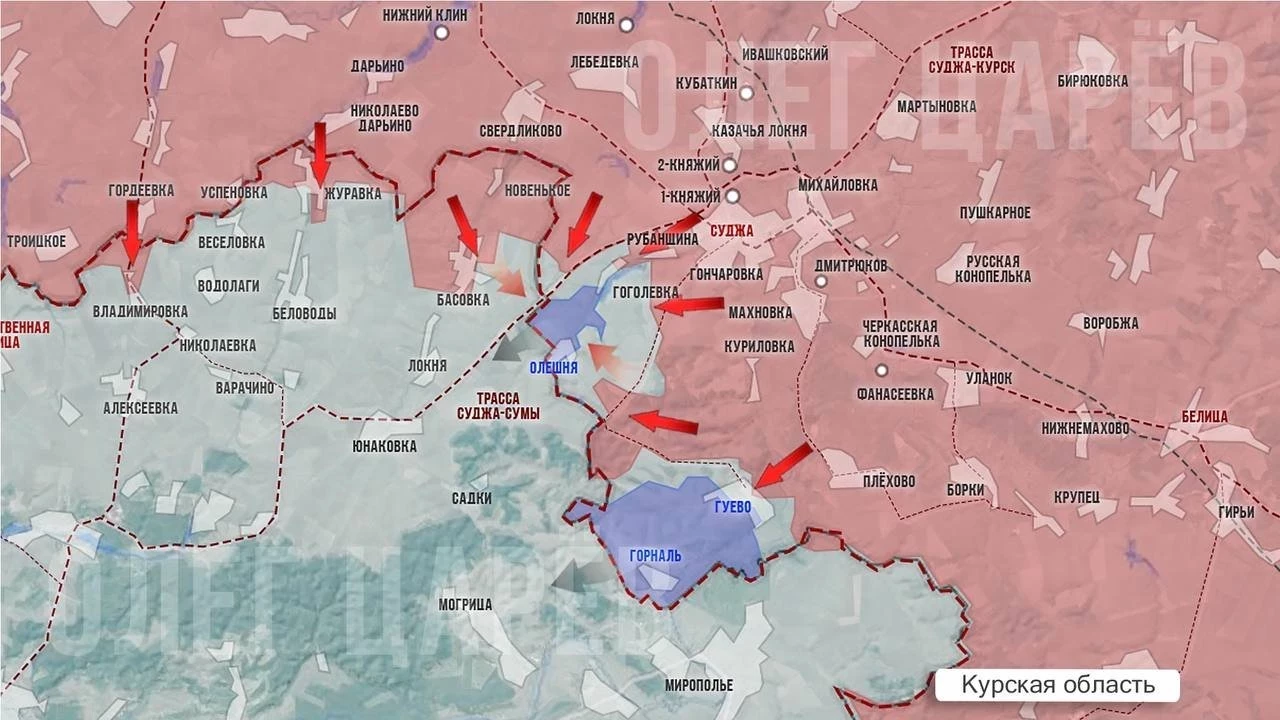 По последним сведениям, нашим штурмовым группам удалось отбить ГИС «Суджа» и АЗС, за КПП идёт бой. Если удастся занять КПП и дорогу, наши части выйдут в тыл группировке ВСУ в Гоголевке. Часть Гоголевки, Олешня, Гуево и Горналь пока остаются под контролем ВСУ, информирует Олег Царёв в своём Telegram-канале.