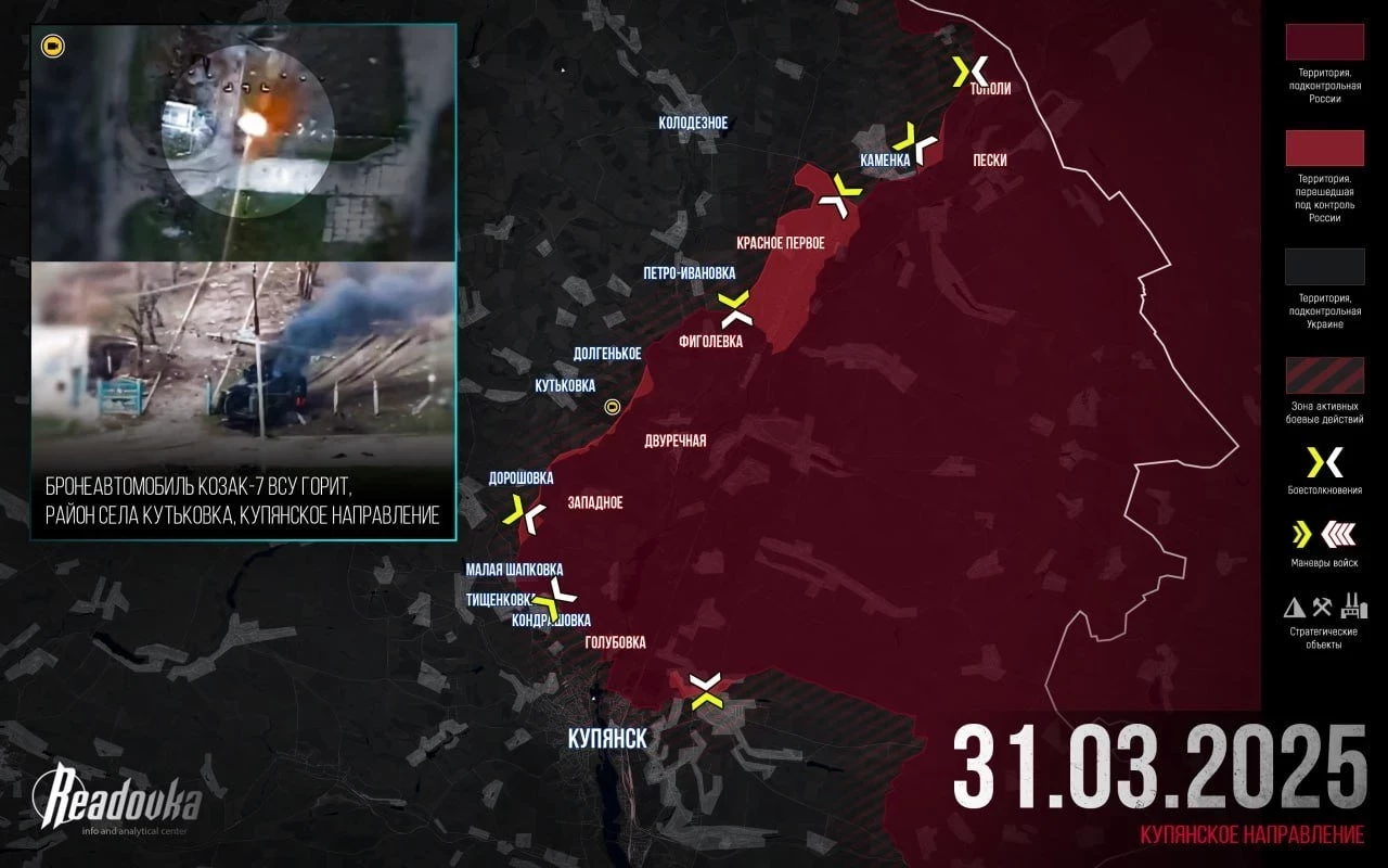 На северном фланге Купянского направления армия России продвигается от Красного Первого к Каменке. Штурмовики перерезали дорогу из этого села в Великий Бурлук и овладели позициями на холмах неподалёку. Есть тактические успехи южнее, в районе Дорошовки.