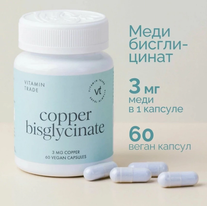 Медь хелат 3 мг VITAMIN TRADE, витамины для кожи, иммунитета, 60 капсул