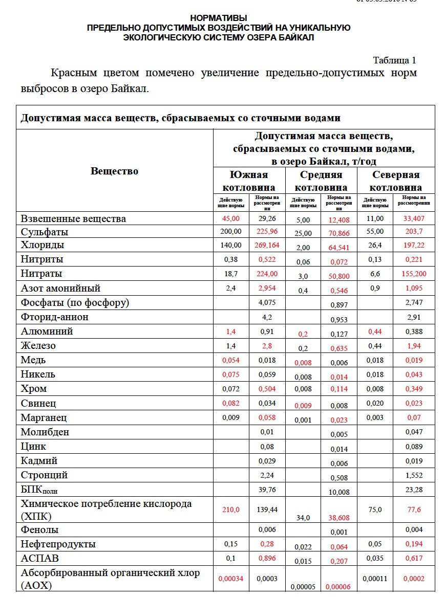 На Байкал надвигается новая угроза в виде проекта Приказа Минприроды РФ «О внесении изменений в Приложение 1 и Приложение 2 к приказу Министерства природных ресурсов и экологии Российской Федерации от 5 марта 2010 г. № 63 «Об утверждении нормативов предельно-допустимых воздействий на уникальную экологическую систему озера Байкал и перечня вредных веществ, в том числе веществ, относящихся к категориям особо опасных, высокоопасных, опасных и умеренно опасных для уникальной экологической системы озера Байкал».