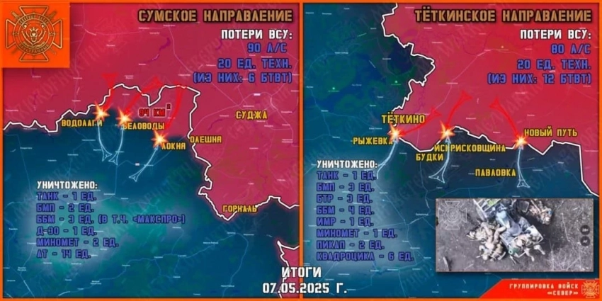 В свою очередь Telegram-канал "Северный ветер" сообщает о том, что 7 мая группировка войск "Север" уничтожала передовые, инженерные и штурмовые подразделения противника на Тёткинском и Глушковском направлениях, продолжила создание полосы безопасности в Сумской области
