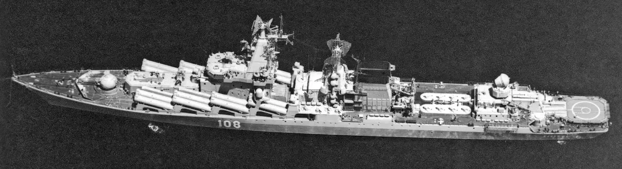 Фотоснимок крейсера «Слава» сделанный с борта палубного вертолёта «Си Кинг» в 1983 году.