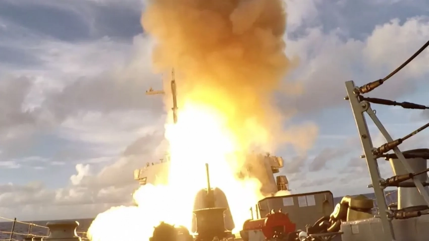 Эсминец USS Benfold (DDG 65) типа Arleigh Burke пускает ракету Standard Missile SM - 6 во время тестового морского удара по списанному фрегату USS Vandegrift в рамках учений Valiant Shield 2022 (VS 22) 16 июня 2022 года.