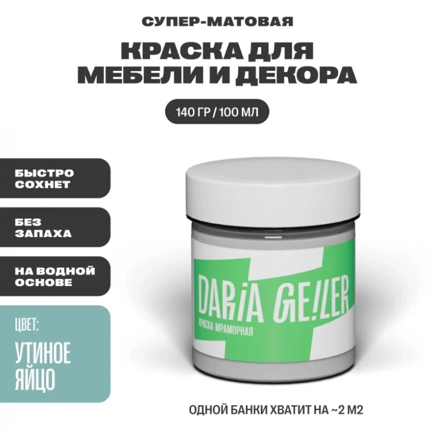 Краски Daria Geiler — это не просто акриловое покрытие, а целая философия преображения интерьера. Благодаря продуманной формуле с использованием латексов премиального качества и мраморного наполнителя, краска ложится легко, создаёт прочное, бархатистое покрытие и отлично перекрывает даже тёмные поверхности без грунтовки. Три линейки — титановая, интерьерная и мраморная — позволяют выбрать решение под любую задачу: от апсайклинга мебели до сложных декоративных эффектов. Это удобный, экологичный и эстетически безупречный выбор.