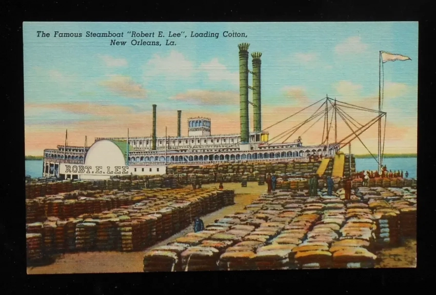 Цветная открытка того времени изображающая пароход «Роберт. Е. Ли» поставленный под погрузку кип хлопка