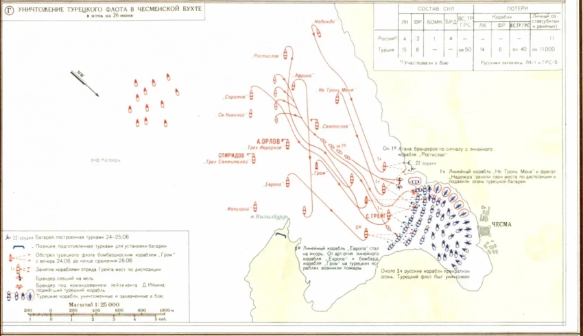 Русский флот в бою Хиосском проливе потерял один линейный корабль. В битве при Чесме русские потери составили всего 11 человек.