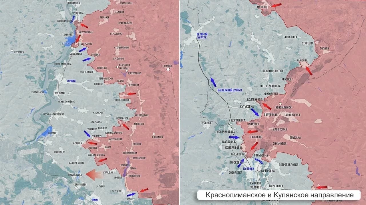 На Краснолиманском участке ВС РФ, по данным с мест, заняли Зелёную долину. Кроме того, есть продвижение наших восточнее Карповки. Выше по фронту отмечено продвижение примерно на 4 км к Боровой, до нее ещё более 8 км.