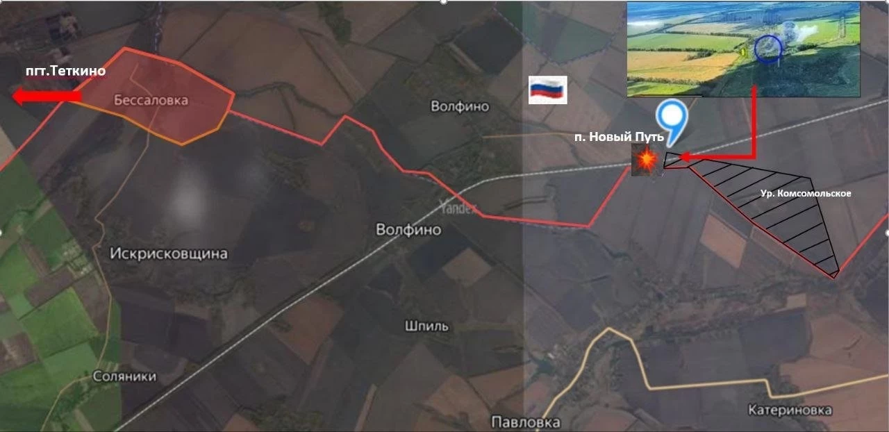 На участке около п.Новый Путь (центральная часть) зафиксировали присутствие штурмовой группы ВСУ. ВС РФ нанесли авиабомбовый удар по этой точке. На данный момент от урочища Комсомольское до места поражения добавляется серая зона. Ведём работу по обнаружению и выбиванию оттуда противника.