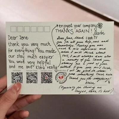 Чешский журналист написал на открытке для медиаассистента Вэй Юнцзя: «Спасибо за помощь, заботу и информационную поддержку. Теперь всякий раз, вспоминая Всемирные игры в Чэнду, я буду вспоминать и тебя. Спасибо, что познакомил меня с вашей культурой. Если приедешь в Чехию, я обязательно покажу тебе все достопримечательности».