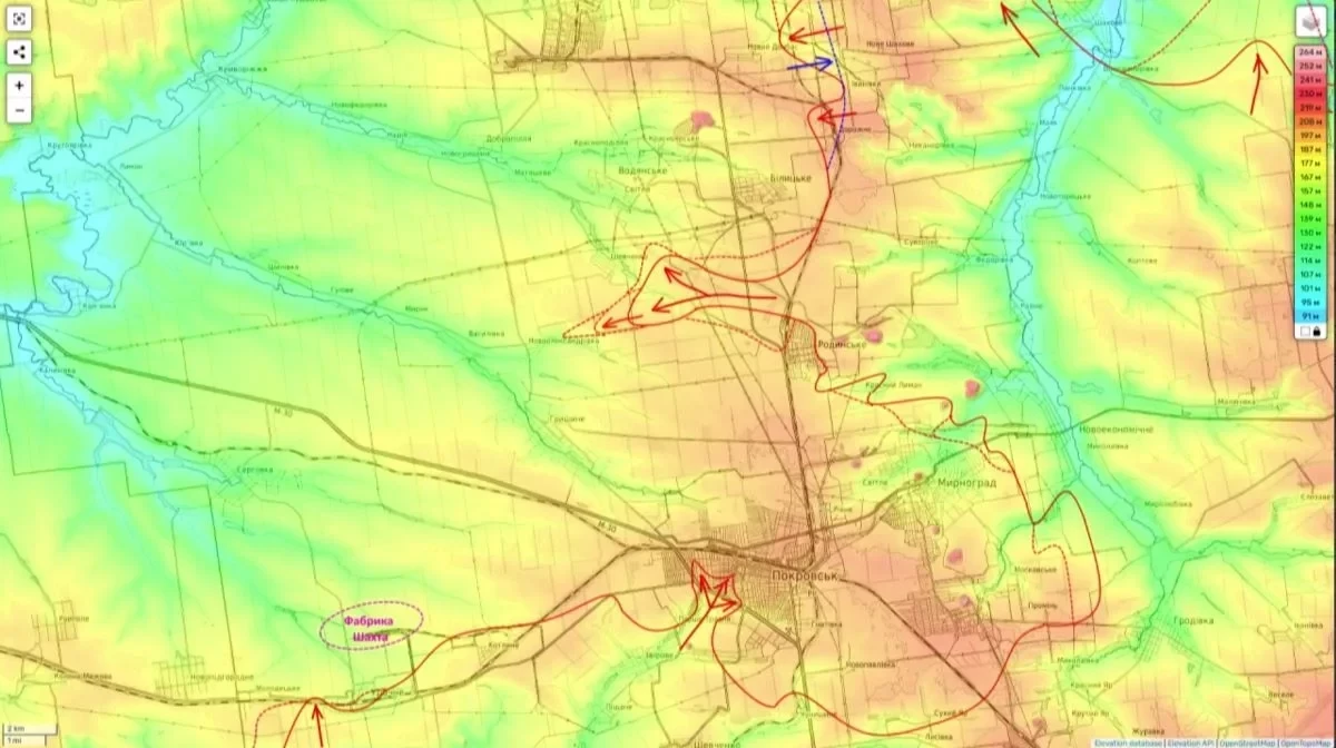 Одновременно с этим продолжаются тяжелые бои в Родинском, а также в районах населенных пунктов Удачное и Молодецкое. Намечается и новый вектор атаки из района Котлино в направлении шахты «Южно-Донбасская №3». Успех на этом участке открывает прямой путь к окружению всей Покровской агломерации.