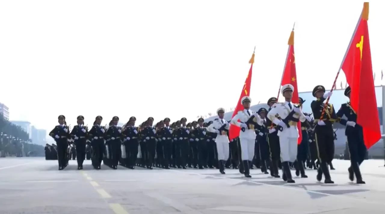Парад в Пекине открывался знаменосцами и красным флагом с серпом и молотом