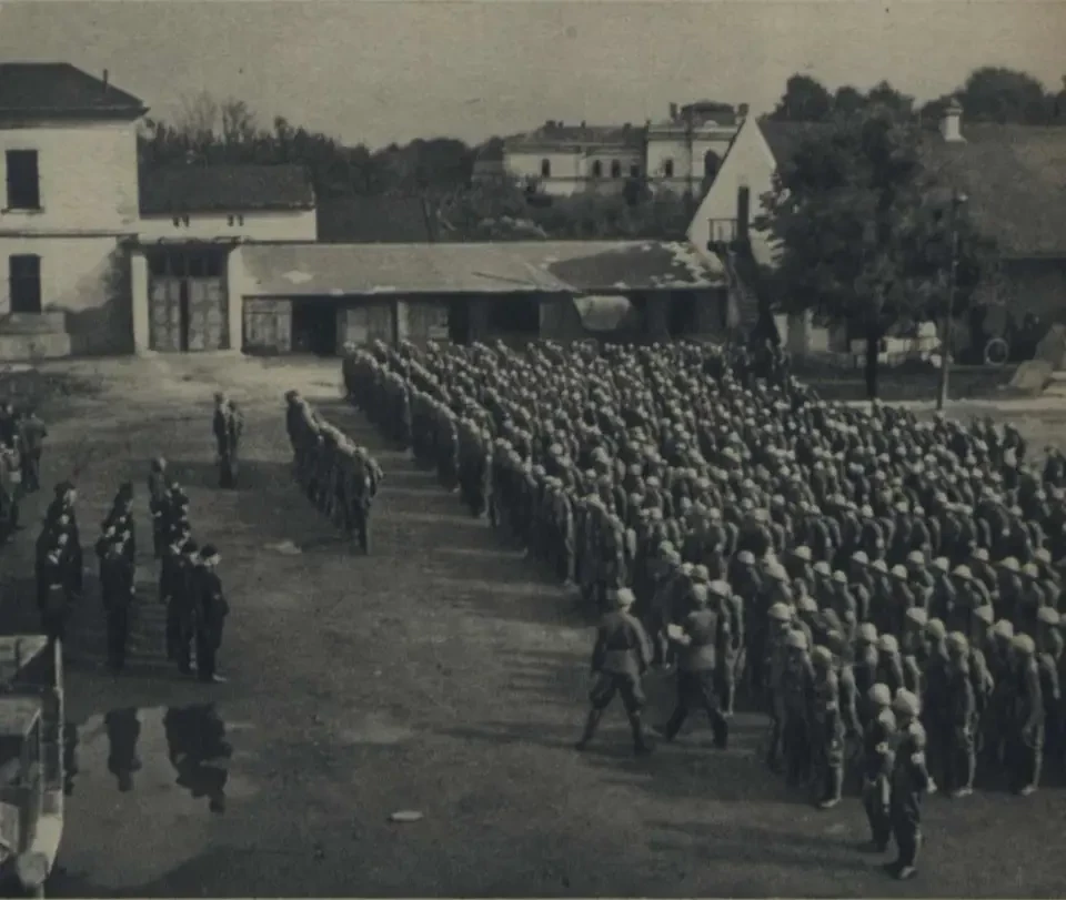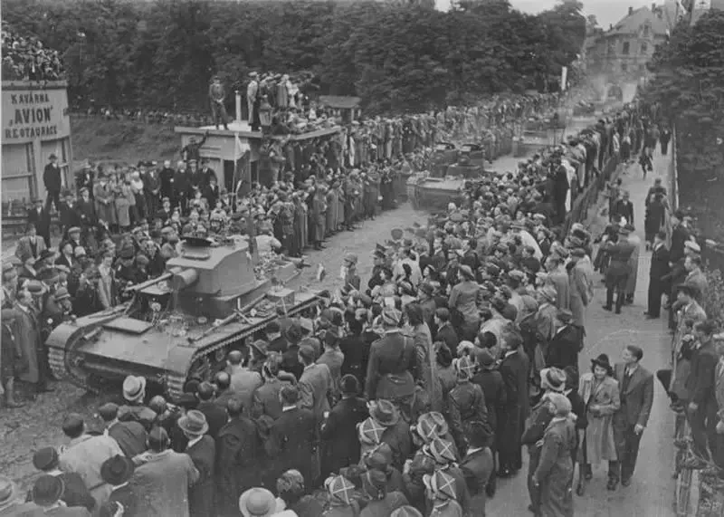 Польские кавалеристы проходят парадом по чешскому городу Карвина, оккупированному в ходе операции «Заользье». Польская часть населения встречает войска цветами. Октябрь 1938 года. Чехословацкий город Карвин являлся центром тяжелой промышленности Чехословакии, производства кокса, одним из важнейших центров добычи угля Остравско-Карвинского каменноугольного бассейна. Благодаря проведенной поляками операции «Заользье» бывшие чехословацкие предприятия уже в конце 1938 года дали Польше почти 41% выплавляемого в Польше чугуна и почти 47% стали.