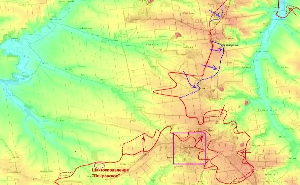 Кроме того, севернее, российские части развивают успех, практически полностью взяв под контроль Орестополь (вероятно, имеется в виду Старомлыновка или схожий н.п.). Переправившись через реку Волчья, войска, по мнению блогера, попытаются завязать бои за Великую Михайловку и прощупать оборону в сторону Александровки, которая является предместьем Покровска (бывший райцентр Днепропетровской области).