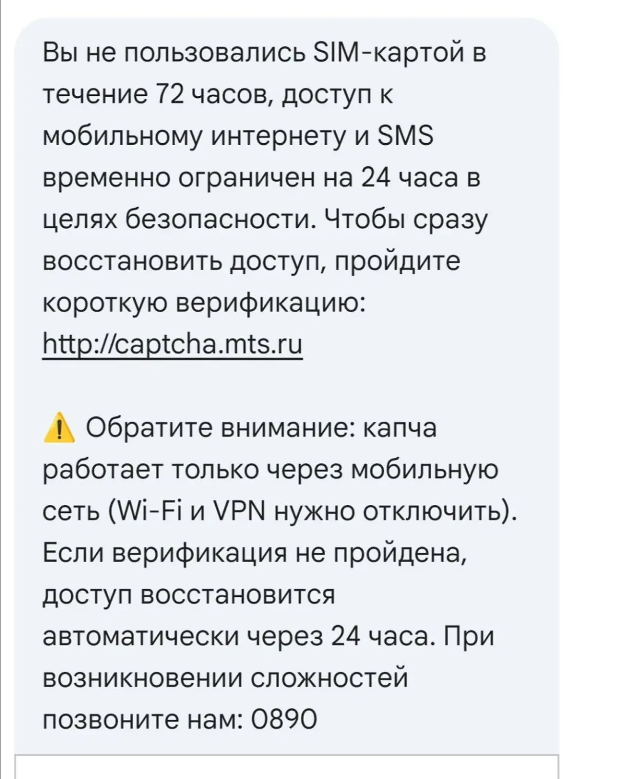 У второго представленного оператора - «интереснее». Чтобы пройти верификацию того, что вы «не верблюд», нужно ввести капчу, перейдя по ссылке. Но есть нюанс. В этом случае, наоборот, не должно быть подключения к Wi-Fi (причём обязательно и без VPN), а должна быть исключительно мобильная сеть. Но пользователи жалуются на то, что при попытке перейти по ссылке в рамках мобильной сети этого же оператора, перехода не происходит. А если происходит, то не всё так просто с той «капчой». В этом случае более надёжный вариант – звонок на короткий номер (указан оператором в СМС), либо (что уже странно само по себе) – подключение к мобильной сети через другую СИМ-карту (если телефон имеет несколько слотов и другая «симка» уже разблокирована). При вводе «капчи» или соединении с роботом по короткому номеру и подтверждении того, что вы это вы, произойдёт разблокировка пакета услуг до истечения 24-часового срока.
