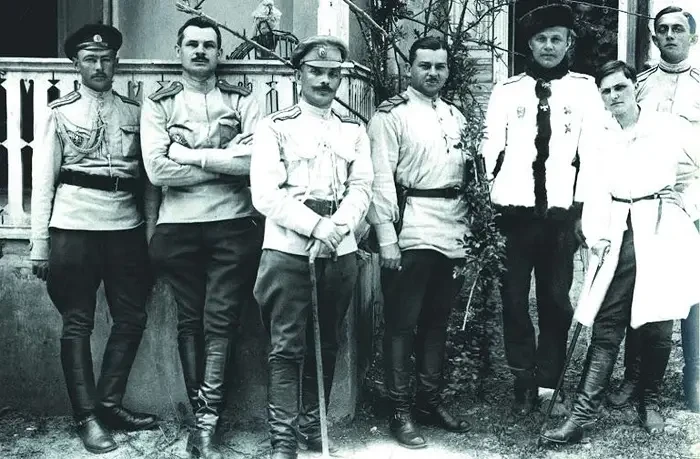 Здесь вы видите (справа налево) есаула Сосинского, Нину Нечволодову, генералов Слащева и Дубяго, полковника Орлова, штабс-капитана Смолина и поручика Брусенцова. Отметим, кстати, что некий поручик Александр Никитич Брусенцов стал героем советского фильма «Служили два товарища», в этой роли мы увидели В. Высоцкого.