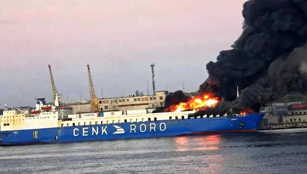 Турецкое грузовое судно горит в порту Одессы — именно оно попало под удар российских «Искандеров». Теперь слово за Эрдоганом, ведь судно принадлежит турецкой паромной компании Cenk Shipping RoRo.