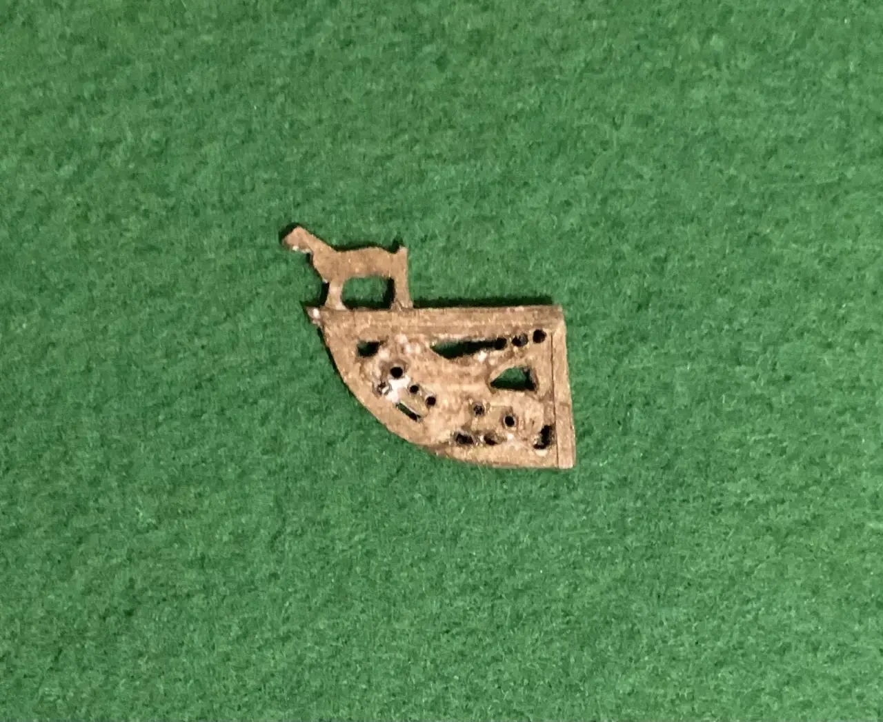 Сложной деталью является флюгер на мачту. Его следует нарисовать на плотной бумаге, а затем аккуратно вырезать острым модельным ножом. Круглые отверстия лучше всего высверлить микродрелью. Готовый флюгер красят акриловой краской под бронзу или античное золото.