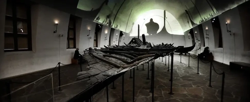 «Осебергский корабль» в новом здании Музея викингов, куда он переехал в конце ноября 2025 года. Фотография Музея викингов в Осло