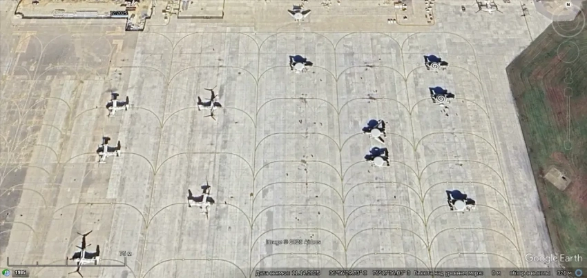 Спутниковый снимок Google Earth: самолёты Northrop Grumman E-2C Hawkeye, находящиеся на базе хранения в Девис-Монтен. Снимок сделан в феврале 2024 года