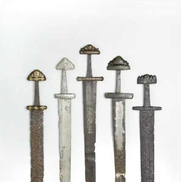 В Норвегии найдено около 3000 мечей эпохи викингов, как простых, так и богато украшенных. На многих имеются инкрустированные надписи ULFBERHT или INGELRII, что указывает на то, что сами клинки ковались на территории современной Южной Германии, а надписи являются своего рода торговой маркой. Слева направо: меч из Стейнсвика, Нордланд, меч из Рисволда в Телемарке, 800-850 гг.; меч из Хедмарка, 900-ый год; меч из Момрака в Телемарке, 950-1000 гг., меч из источника в графстве Хедмарк, 800 г. Музей истории культуры университета в Осло