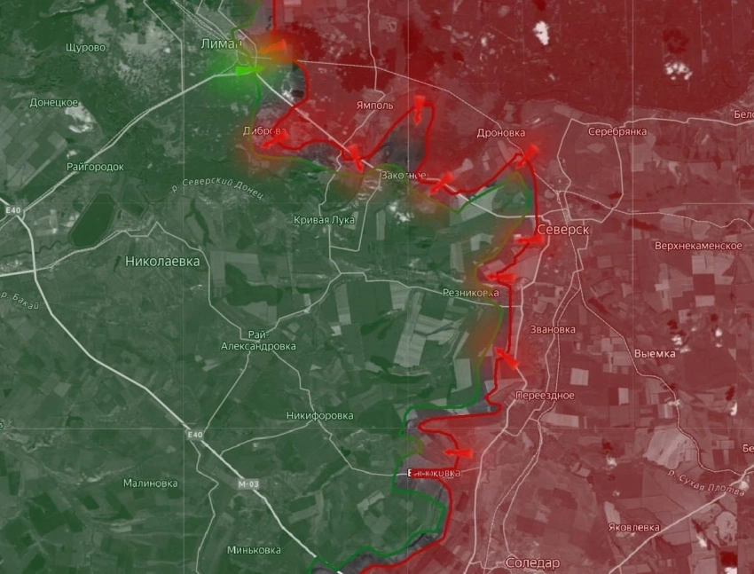 На Северском участке ожесточённые бои в Резниковке, восточная часть села взята под контроль. Западнее Северска ВС РФ продвигаются на запад. В районе Закотного упорные бои за контроль высот южнее. Выход на эти позиции позволит обеспечить северный фланг наступления на Каленики и Рай-Александровку с северо-востока.