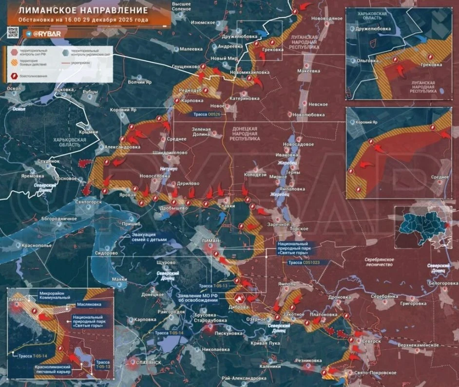На Краснолиманском направлении войска РФ атакуют в районе населённого пункта Диброва. По сведениям источников, ВС РФ вышли на северо-восточные окраины Красного Лимана.