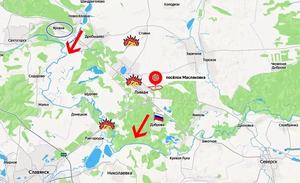 На северном фланге пока что в серой зоне н.п. Яровая. При этом вражеские паблики утверждают, что ВСУ якобы заняли новые позиции возле Лимана (Красного Лимана). Сегодня пишут, что противник выбивает наши группы в районе Масляковки. Этот поселок под нашим контролем, он примыкает с востока к Красному Лиману. Но пока даже Генштаб ВСУ это не подтверждает, сообщая в последней сводке лишь об успешном отбитии атак ВС РФ на этом участке.