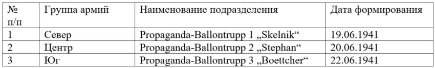 В своих статьях исследователь военной пропаганды Николай Смирнов рассказывает, что также для распространения листовок над тыловыми районами СССР и для воздействия на население крупных советских городов применялись агитационные воздушные шары, ранее успешно показавшие себя в 1940 г. при пропаганде на население Британских островов. Специально для действий на Восточном фронте было создано 3 именных отделения агитационных воздушных шаров, придававшихся группам армий (Север, Центр, Юг).
