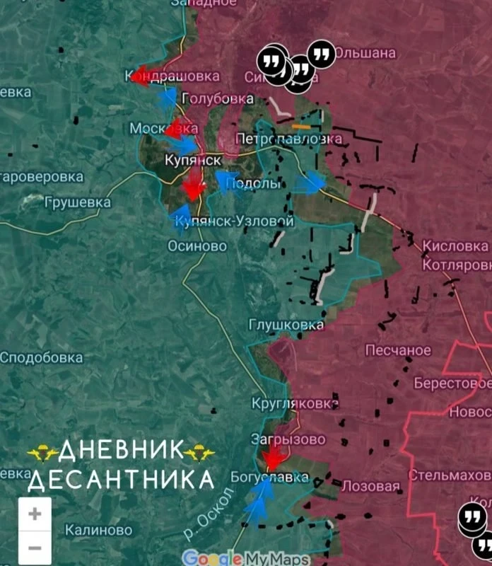 На южном фланге Купянского направления бои разворачиваются южнее Загрызово. Противник стягивает силы в районе Новоплатоновка - Богуславка и предпринимает контратакующие действия в направлении Загрызово, пытаясь стабилизировать линию обороны.